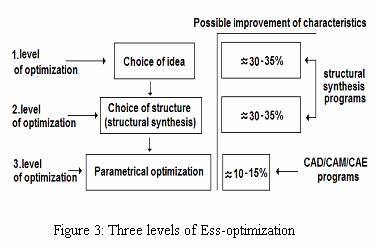 For creation of competitive products in Aeronautics and Aerospace it is typically necessary to synthesize from 50 up to 150 new engineering solutions (ES). [[6]]. In [[7]] 3 levels of optimization are examined at creation of new ES. Performance characteristics of projected systems at the third level of optimization can be improved on the average of 10-15% (Fig. 3). At level 1 and 2 characteristics are improved on the average of 30-35 %, and sometimes more. The higher the level of optimization, the more is the effect of optimization. In engineering practice there is usually no way allowing the choice of an optimum engineering solution based on conditions of the technical project at once.